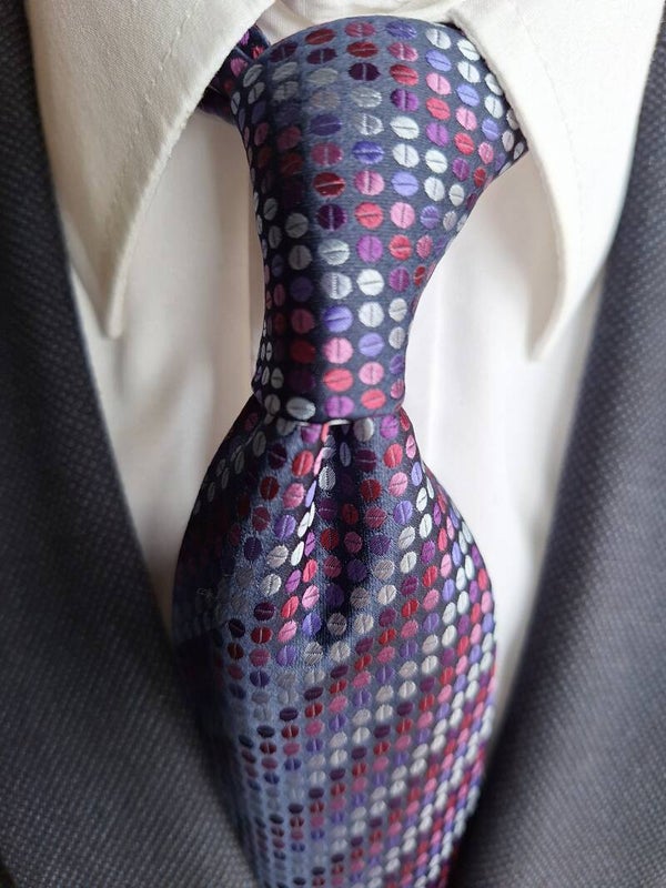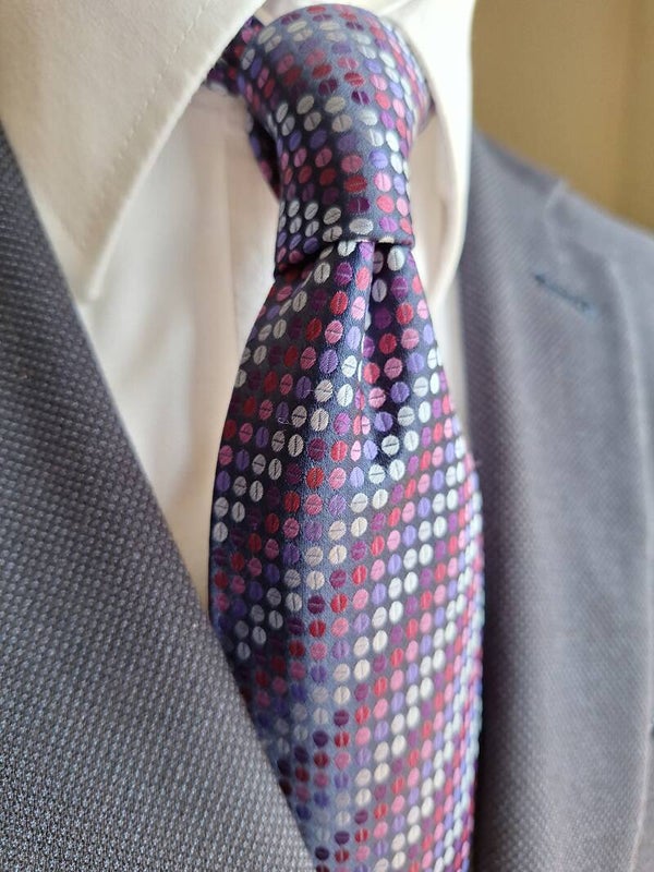 Visually stunning is our ABERTURA THORNTON with rows of pink, silver and purple circles running through the soft silk tie.