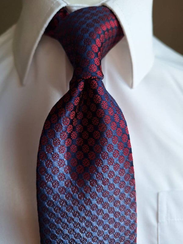 The 148cm length and 7.5cm blade encompasses a superb navy base with red flower pattern on a beautiful soft British silk.