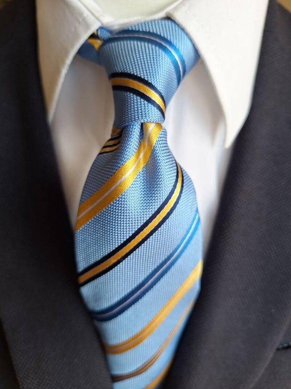 Our Abertura Braemore is a beautifully British made tie, utilising a lovely soft silk with an enchanting striped pattern encorporating white, gold, navy, on a light blue base colour.