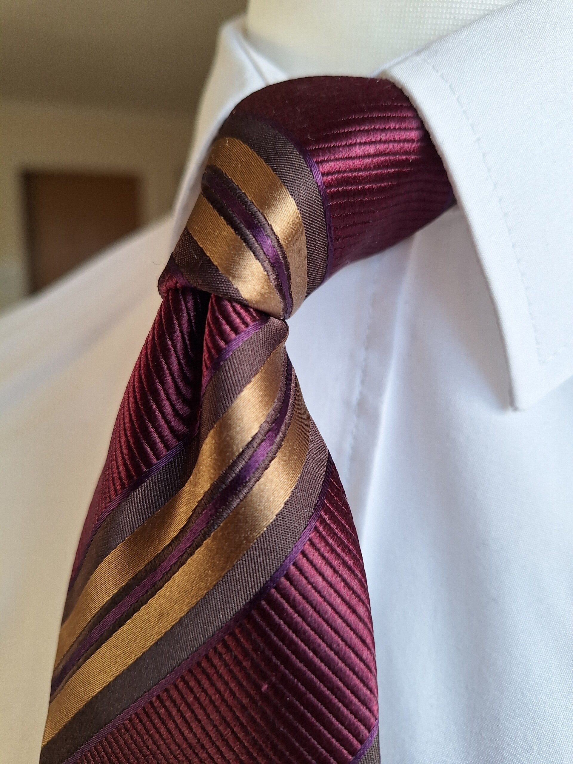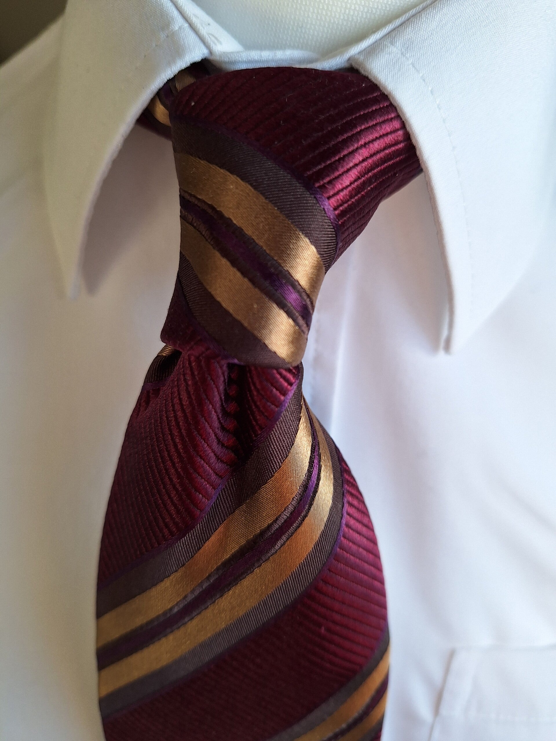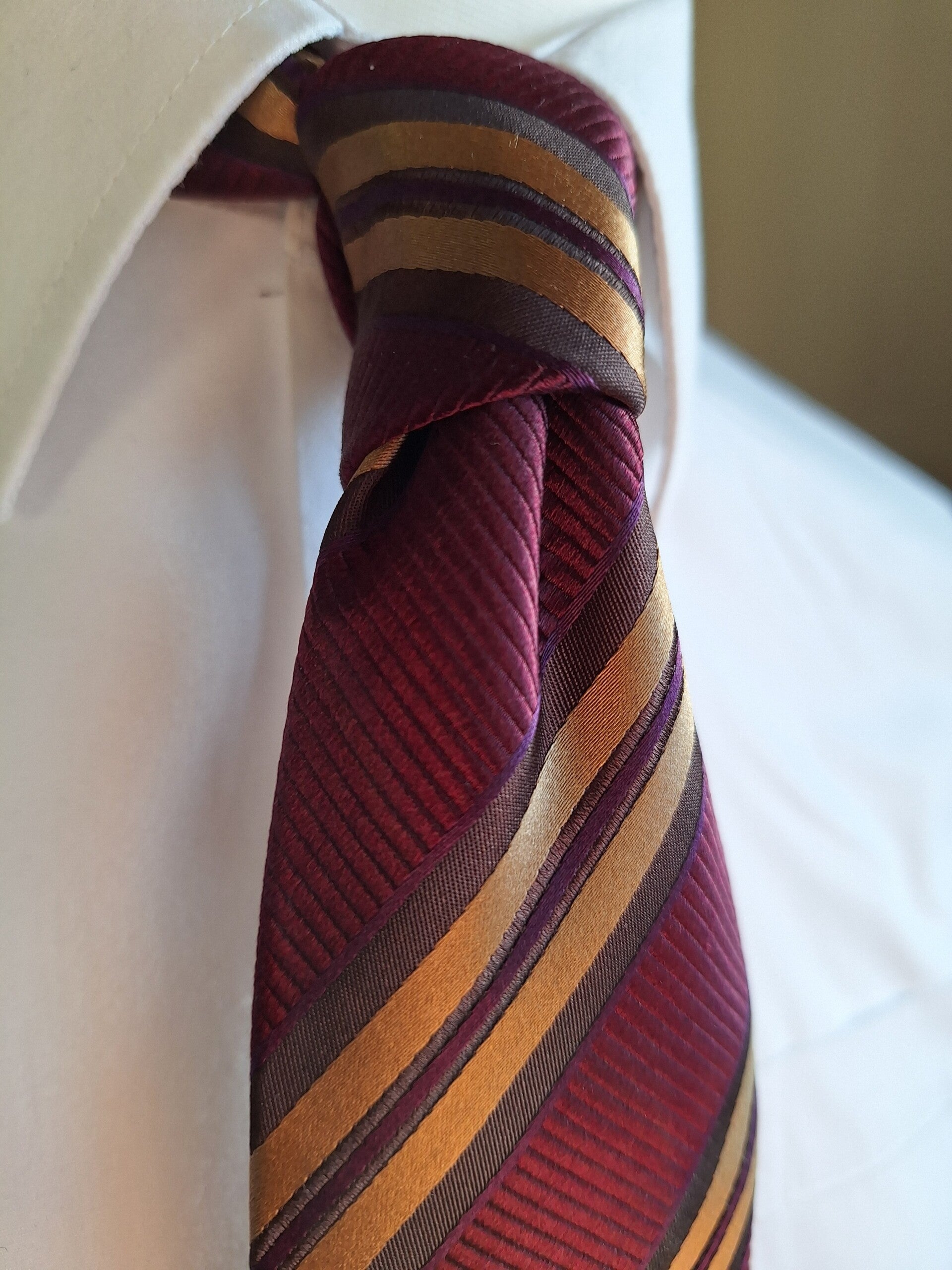 Our lovely Abertura Hadlow is a gold and burgundy striped twill seven fold tie, and is simply stunning on the eye.