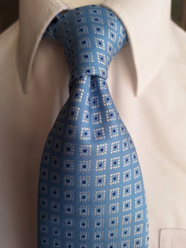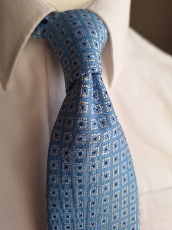 The Abertura Albate is a soft Italian silk tie - light blue in colour with a blue dot, surrounded in a silver square.