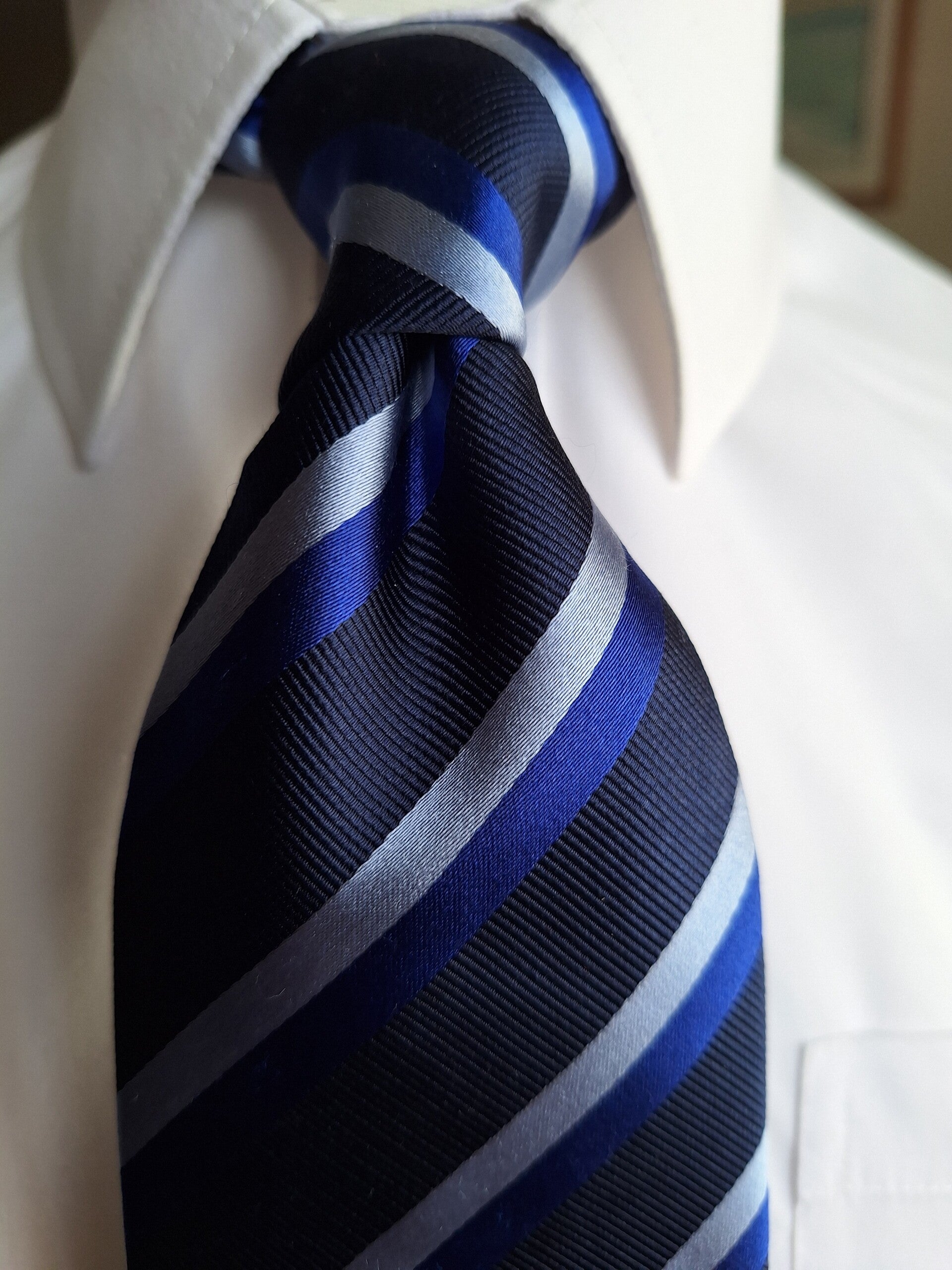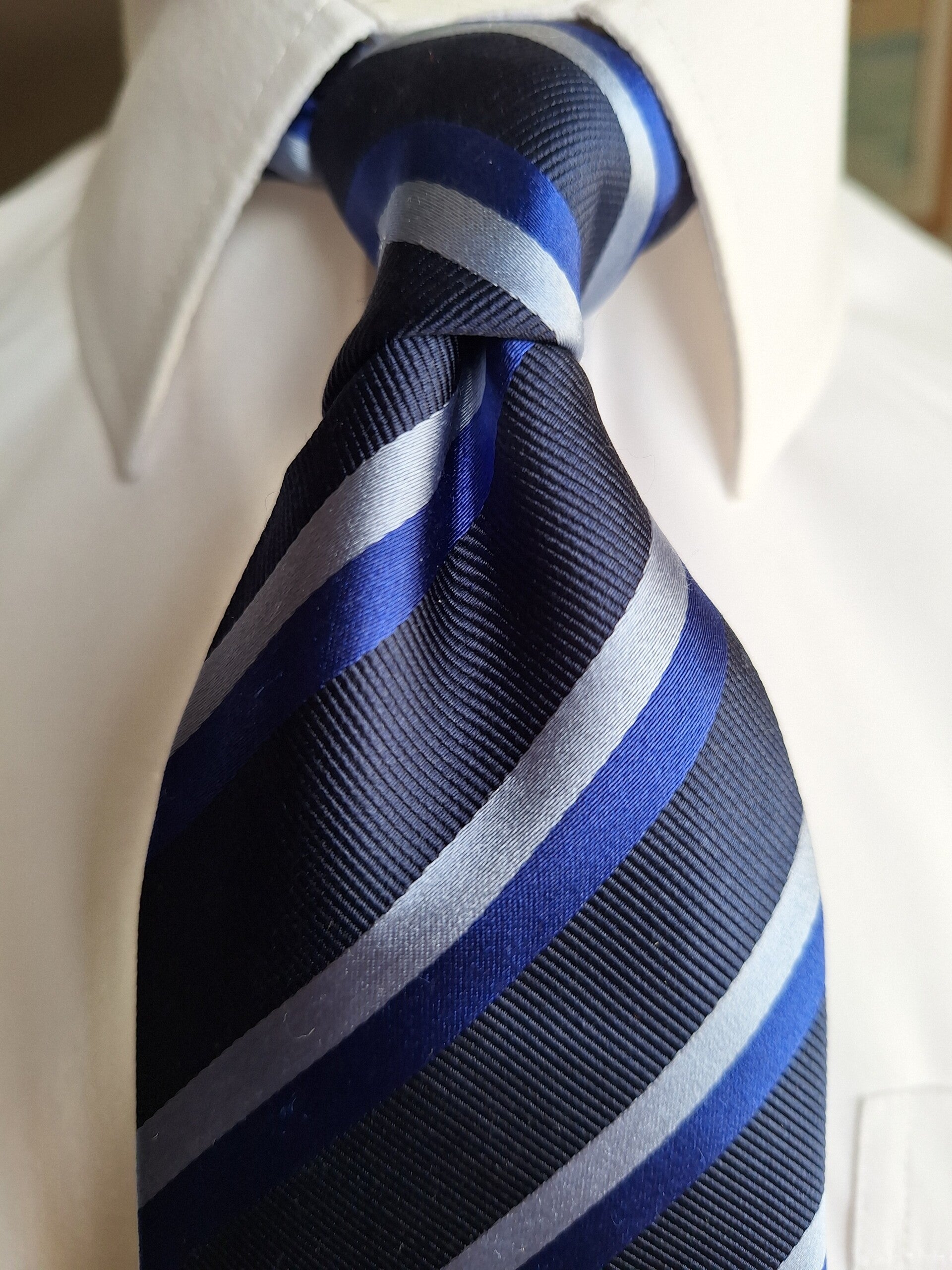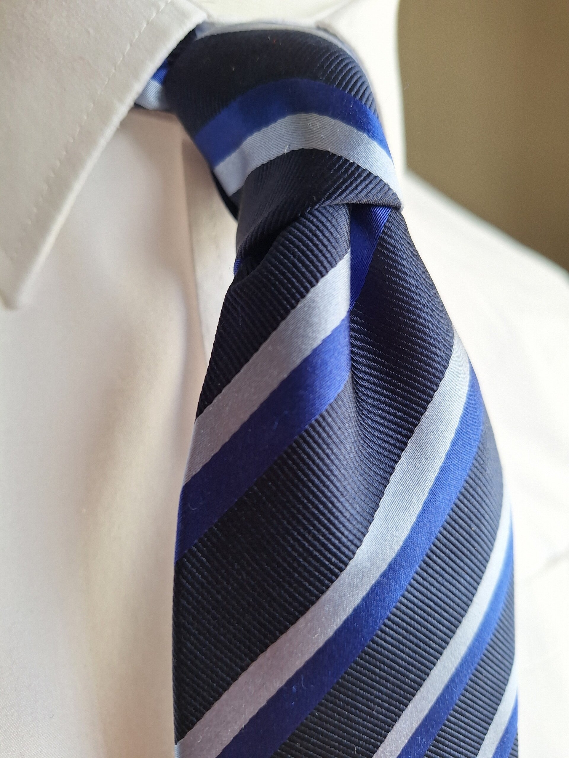 Navy blue base with silver and blue stripes, measuring 14cm with a blade of 9.5cm.