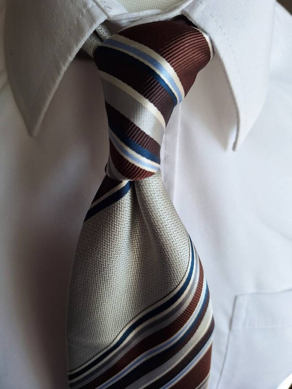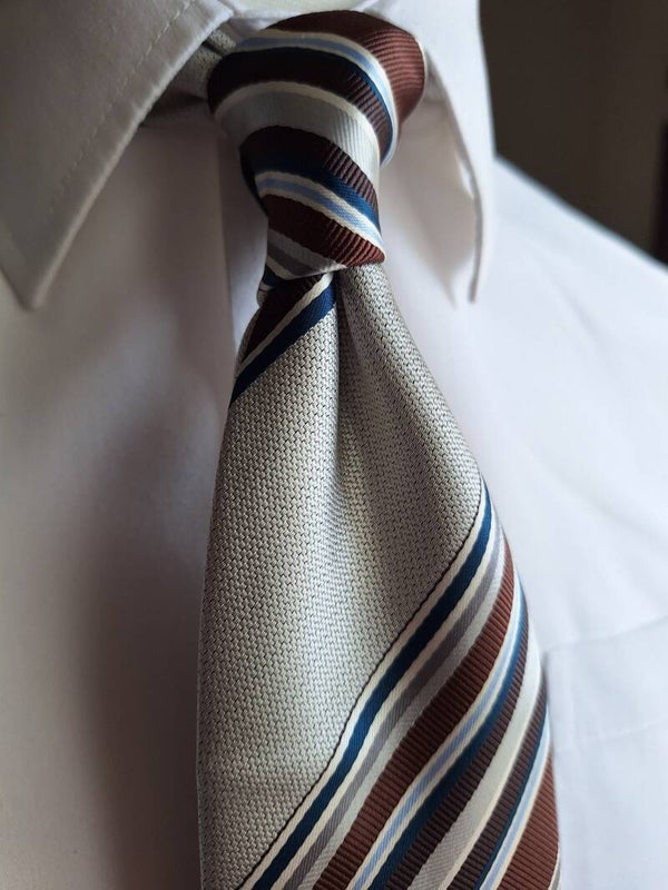 Our Abertura Embleton is a multi stripe silk tie, incorporating colours of silver, light blue, navy, copper, amongst others.