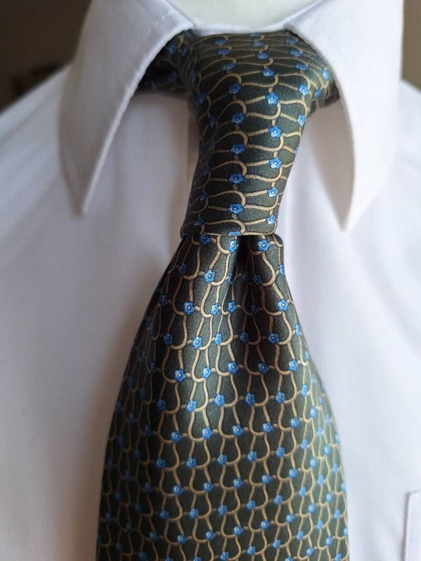 Our soft silk Abertura Varallo is a delightful green colour, with a delicate blue and gold pattern throughout.