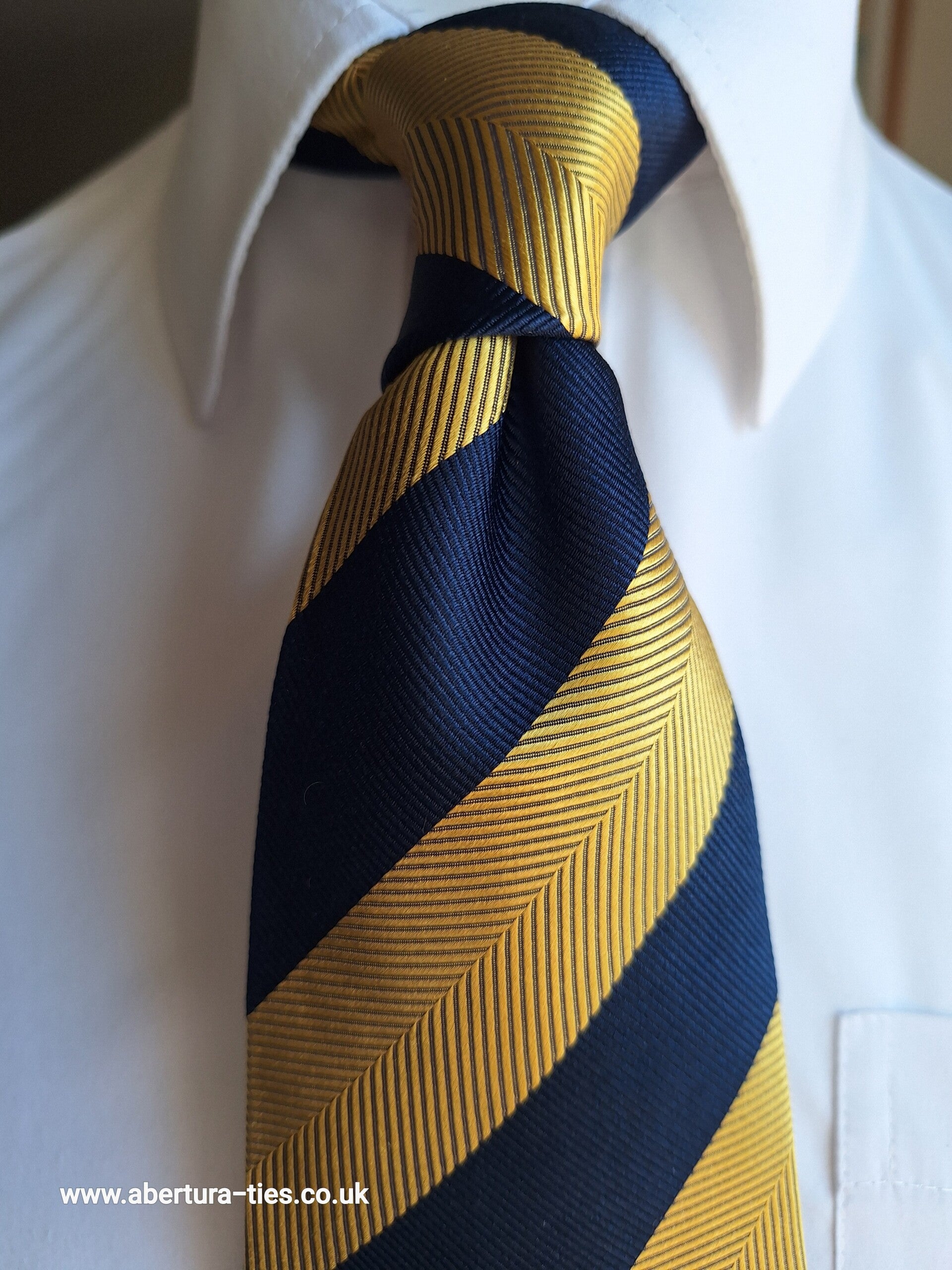 Our silk Abertura Kinloch is a beautiful seven fold tie with gold and navy thick stripes running the entire length.