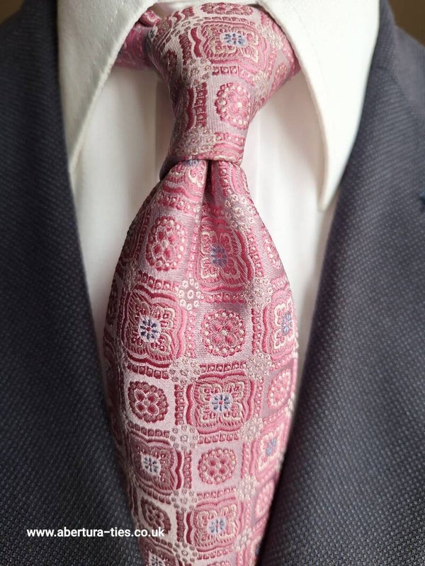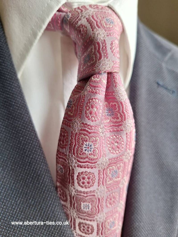 The Abertura Vedano is a truly stunning tie, with a beautiful pink base, with an intricate pattern with silver and blue.
