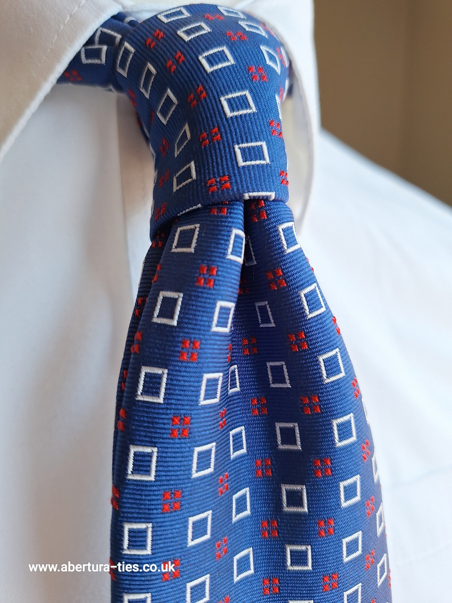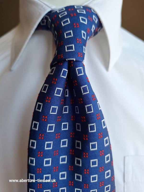 A rich Royal blue forms the base of the tie, interspersed by white squares and also embellished by a delicate red mini pattern.
