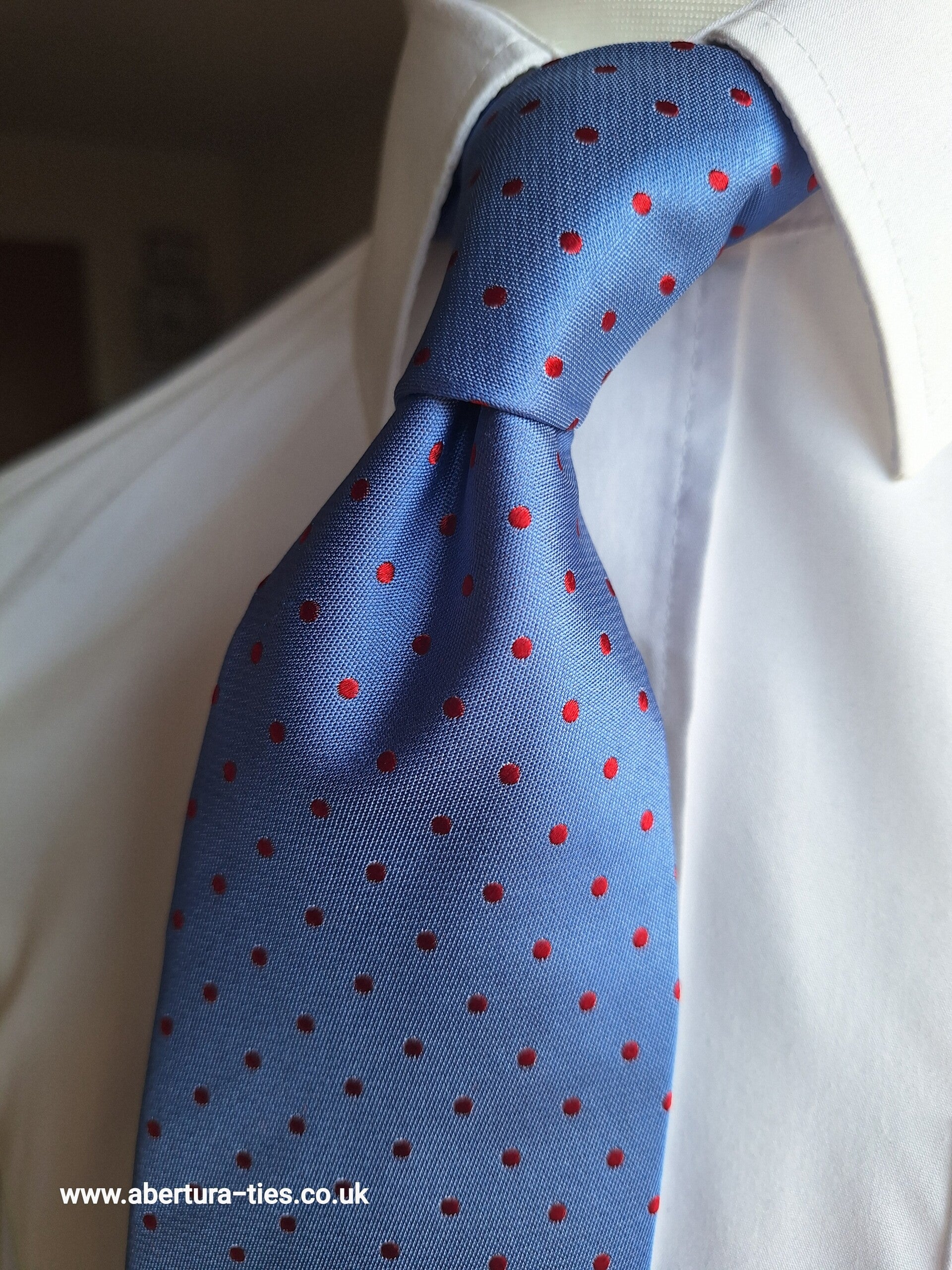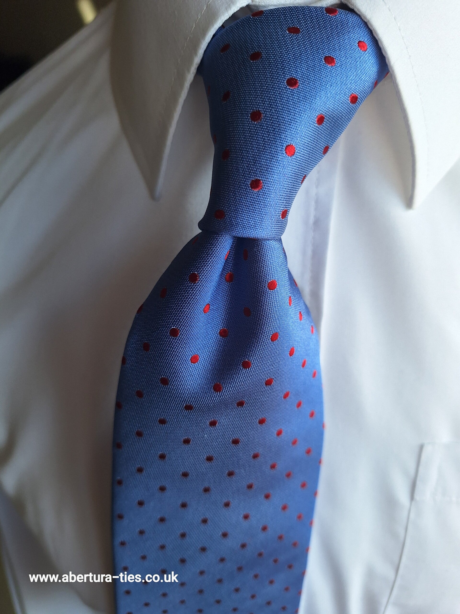 Our Abertura Willington is a beautiful silk seven-fold tie, blue in colour, decorated by a red mini polka dot.