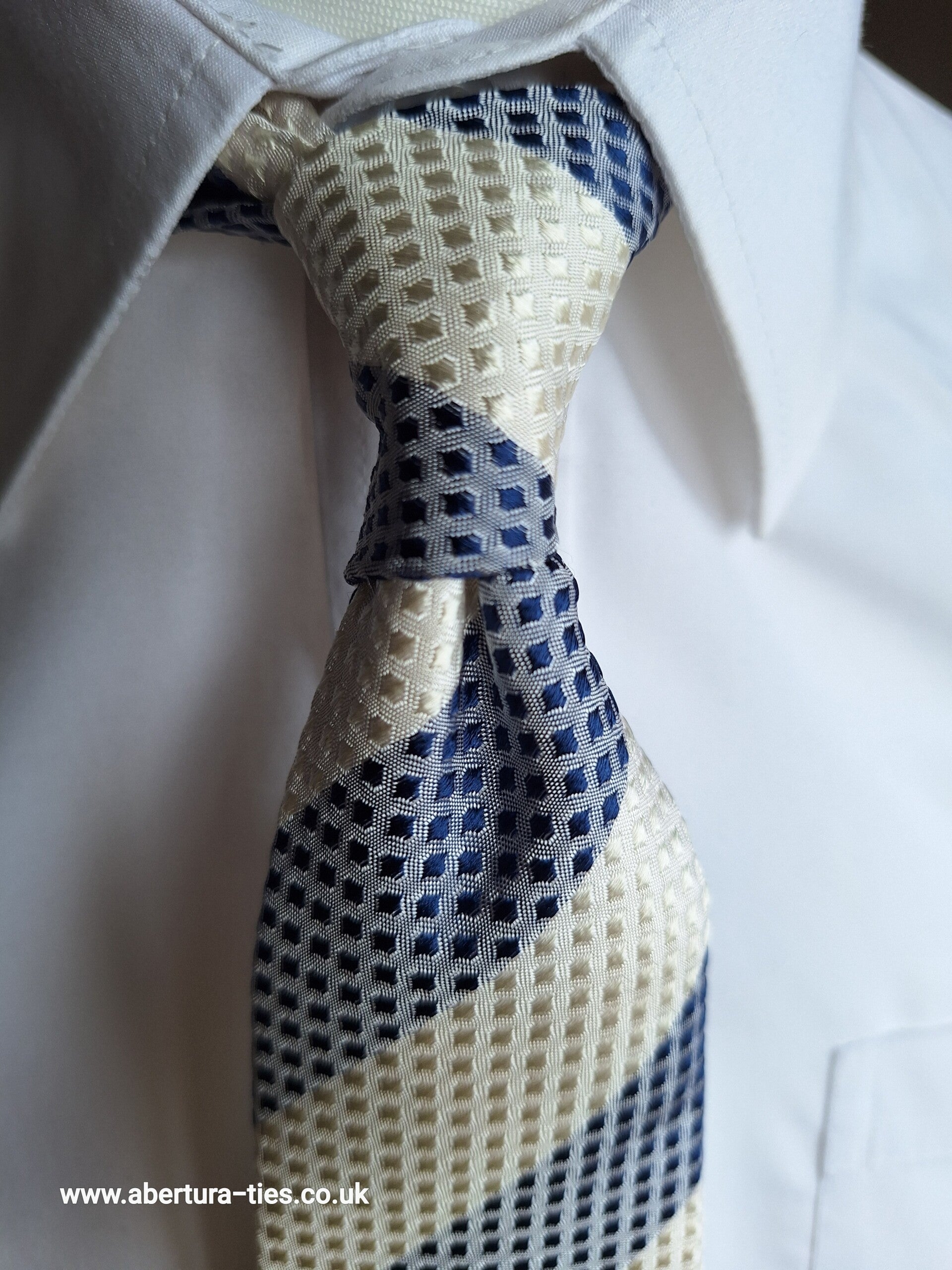 Measuring 148cm and with a blade of 8cm, this grey/blue and white coloured, striped tie is made of a beautiful soft silk with a stunning raised texture.