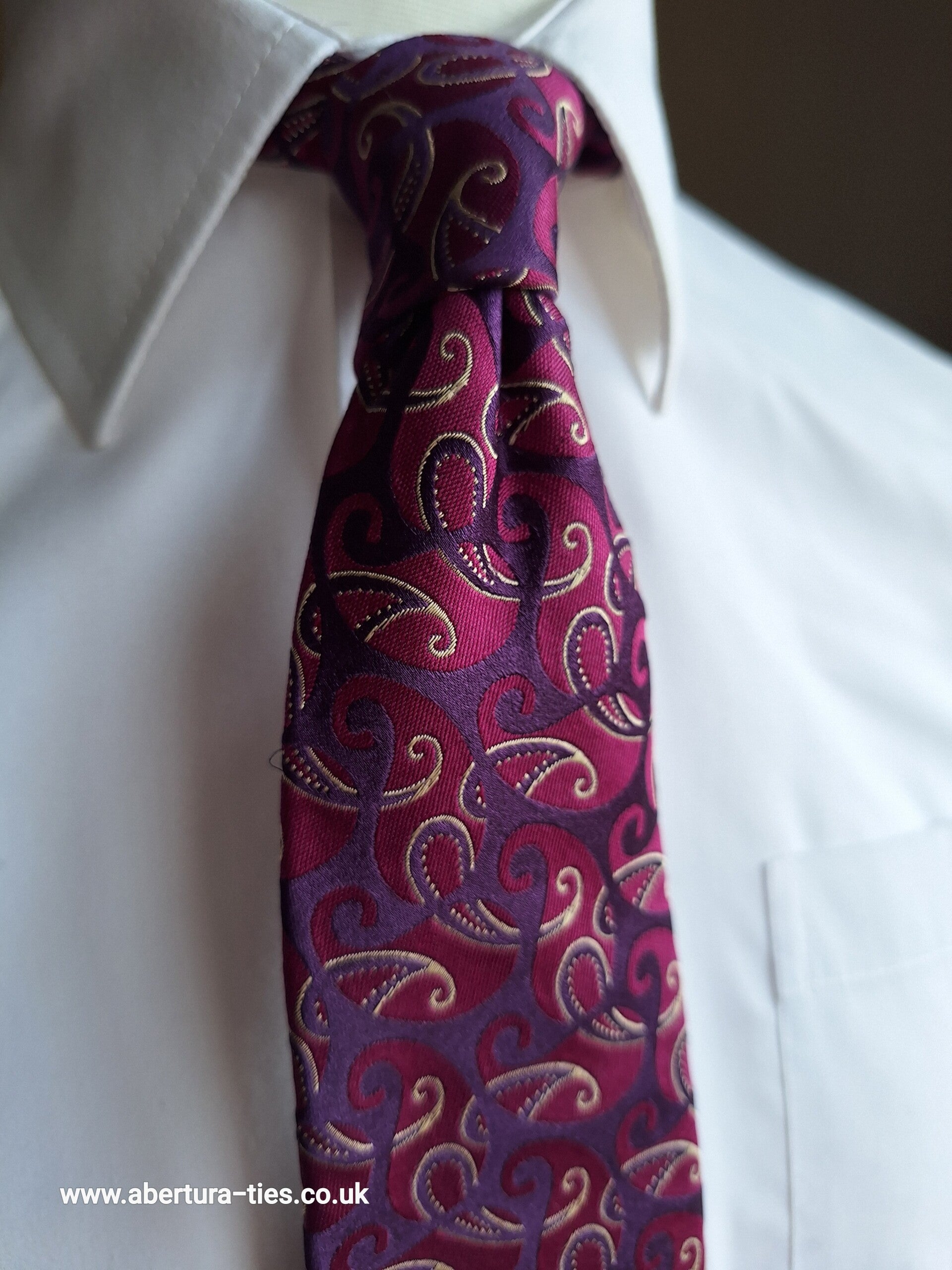 Measuring 148cm and with a blade of 8.5cm, this beautifully decorated tie has a dark pink base, with purple and gold Paisley Pattern detailing.