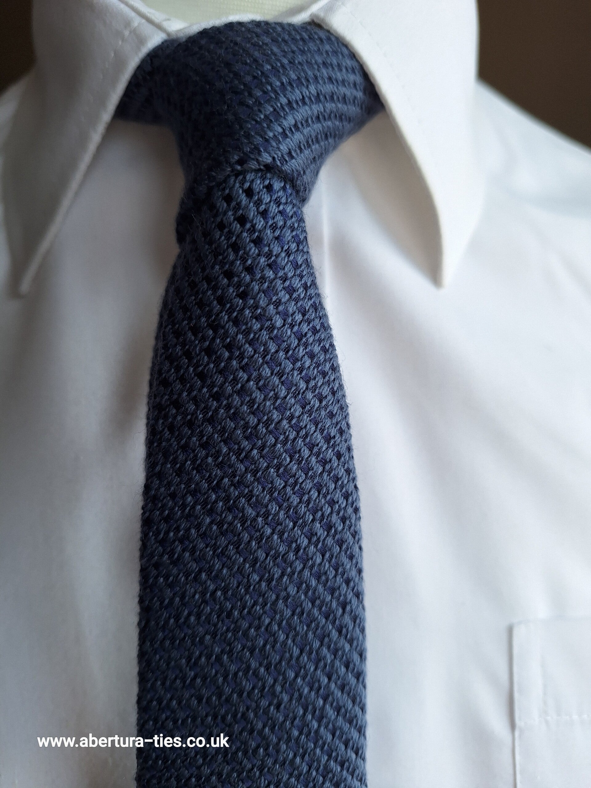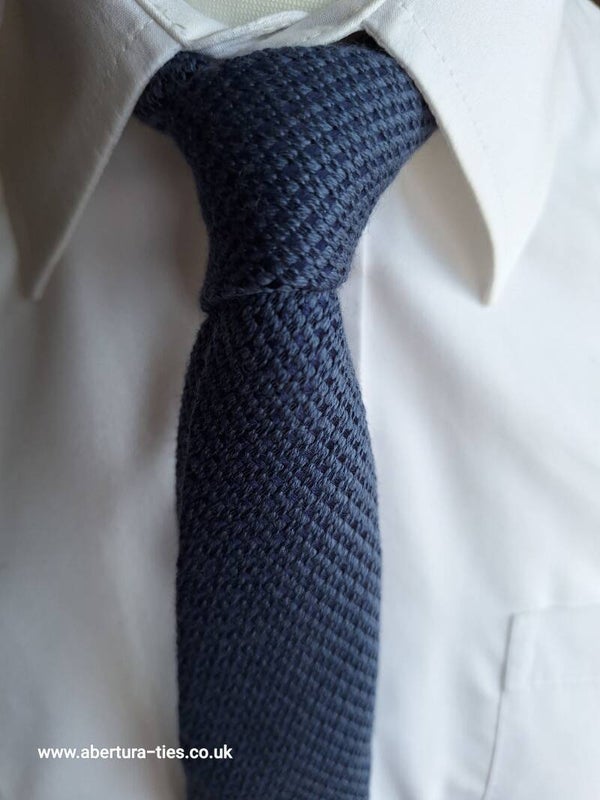 Measuring 146cm and with a blade of 6.5cm, this beautifully soft knitted narrow tie is turquoise with a subtle navy detailing.