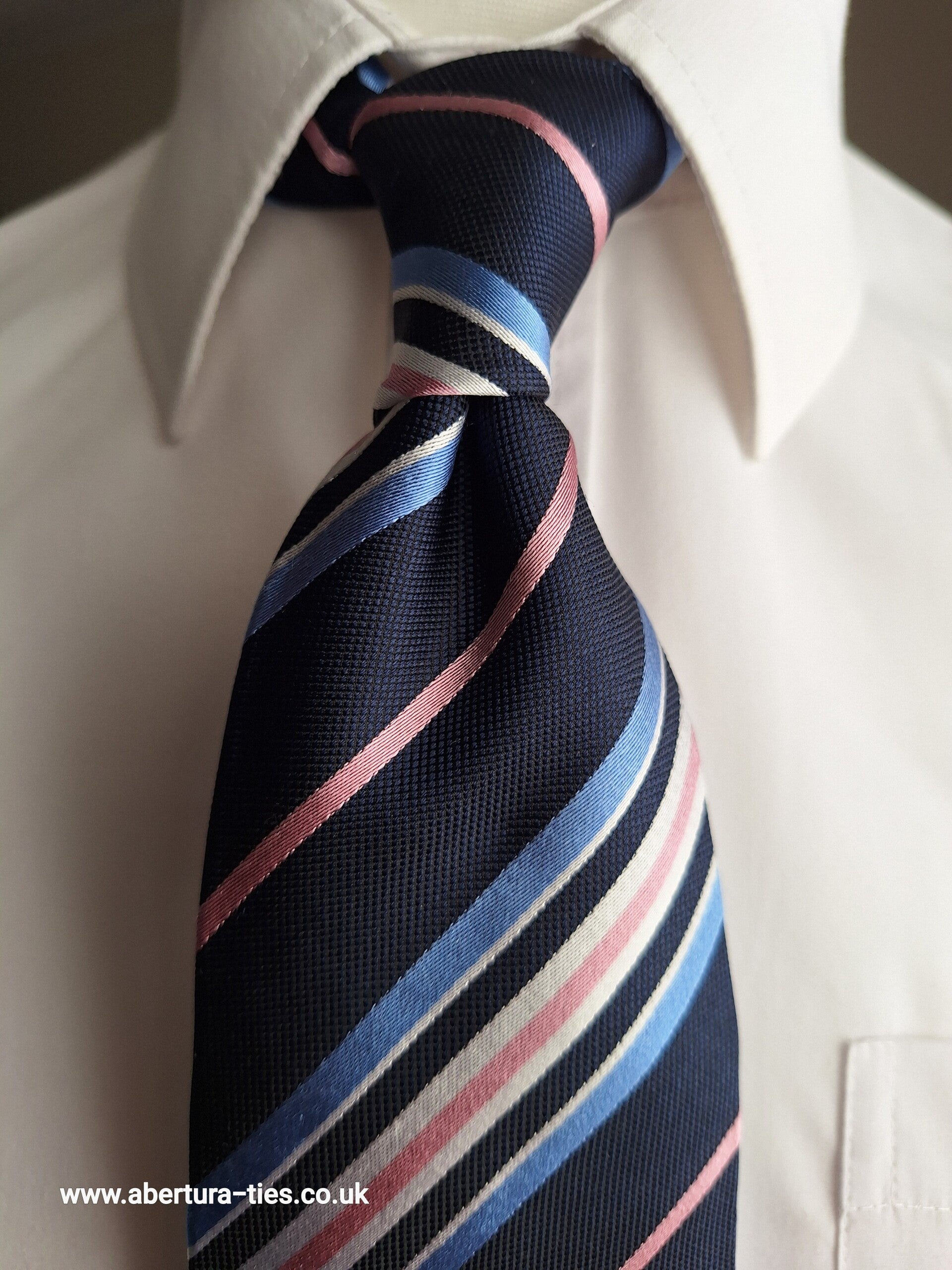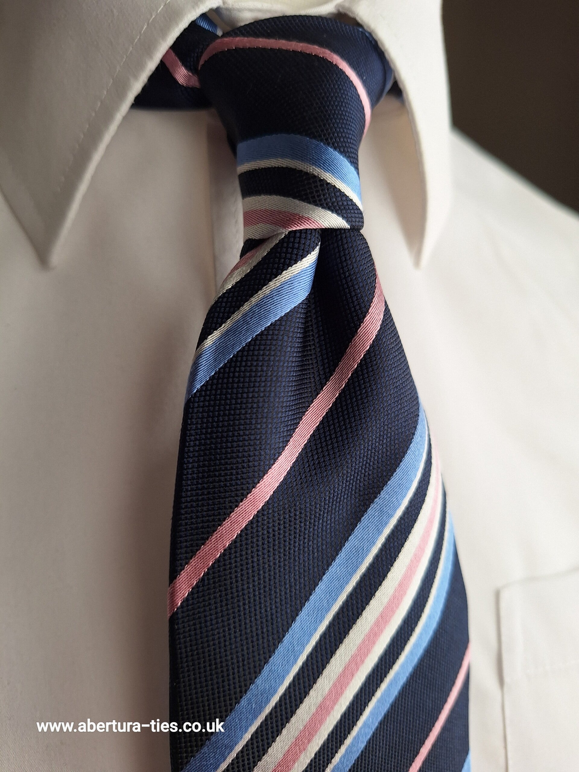 Our lovely Abertura Mitford is a seven fold tie with a navy base, incorporating pink, blue and silver multi-stripes, and is simply stunning on the eye.