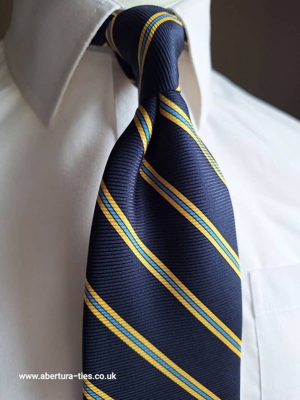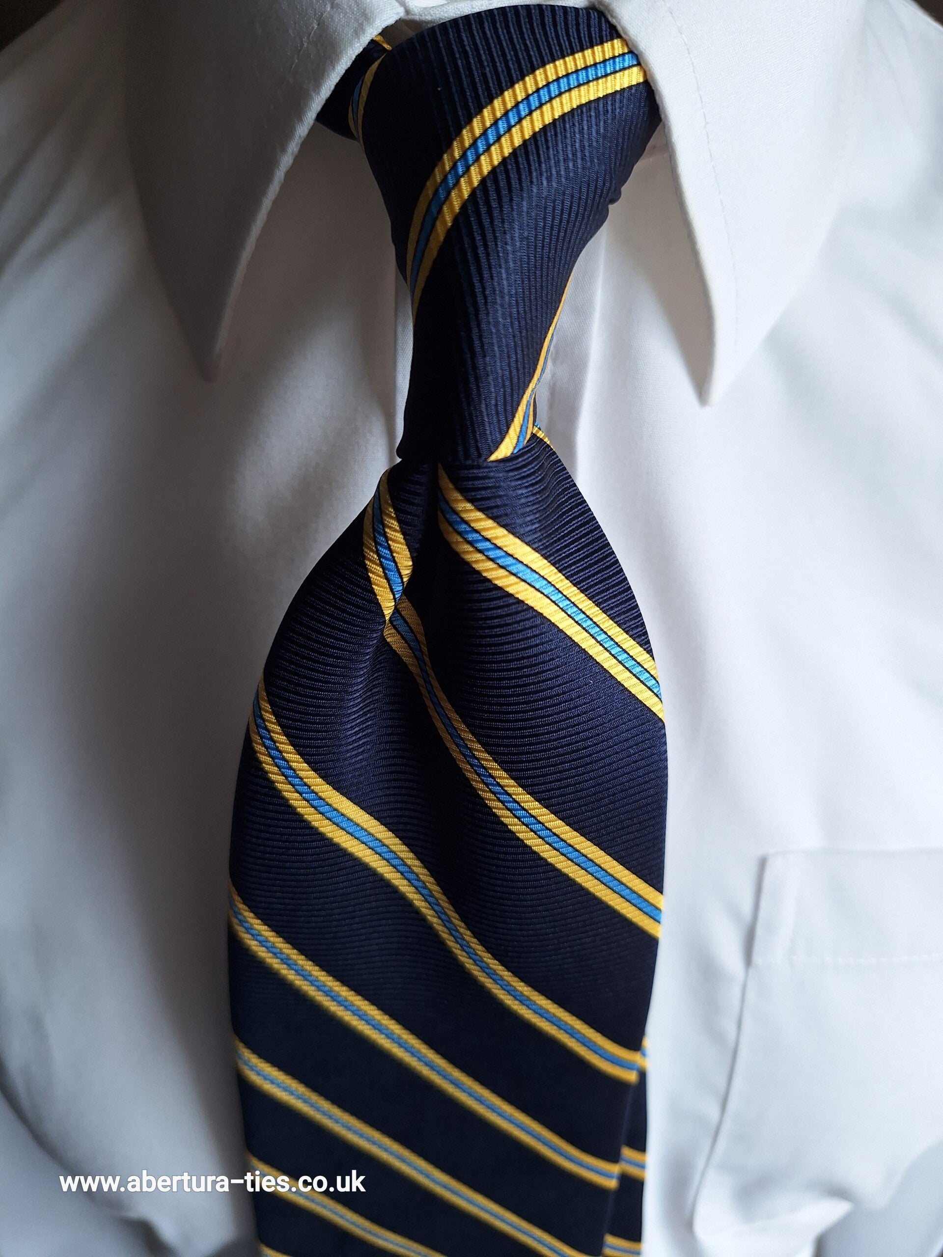 With a superb navy base, this beautiful John Comfort tie has a yellow and blue stripe decorating the colourway.