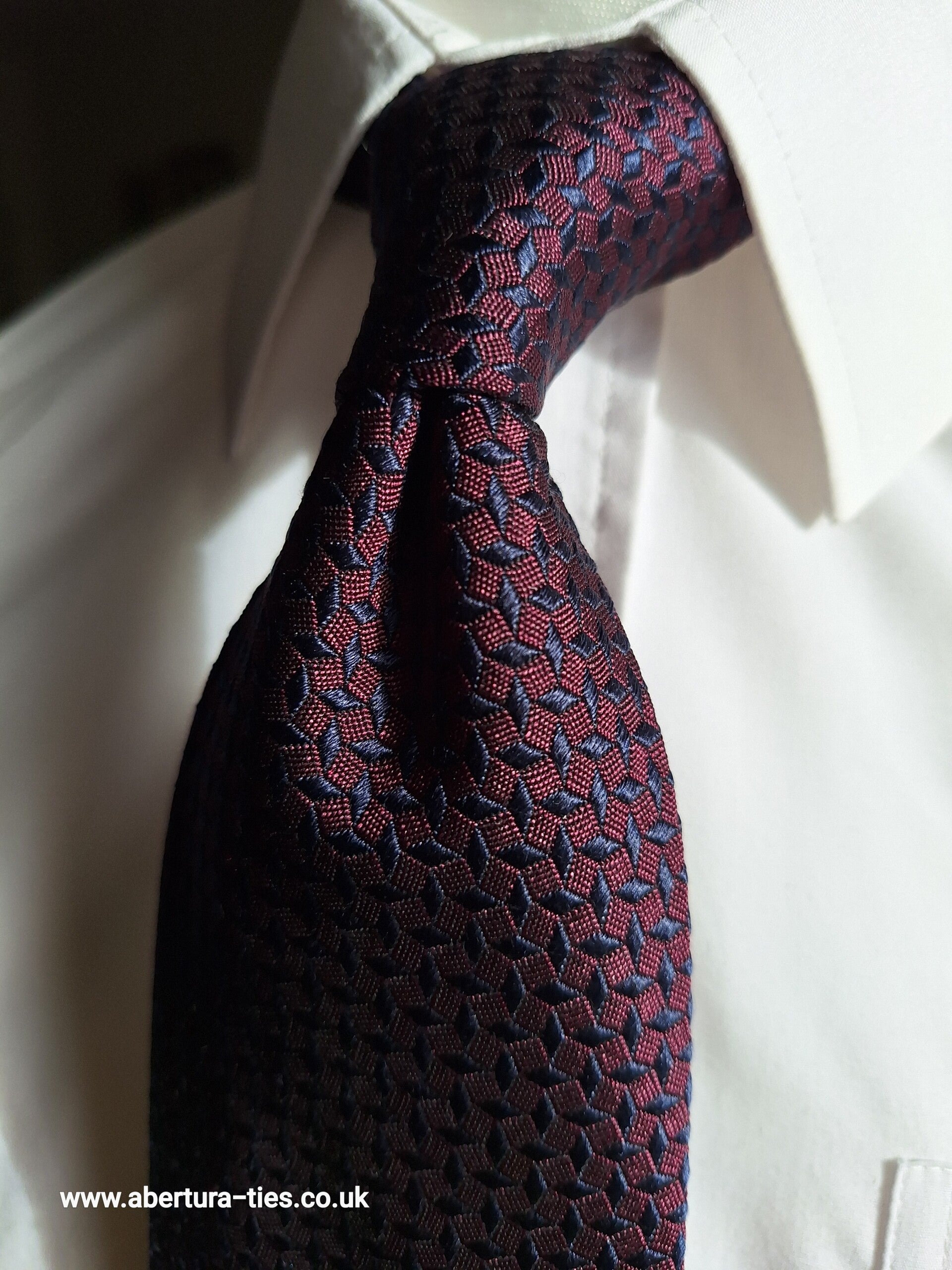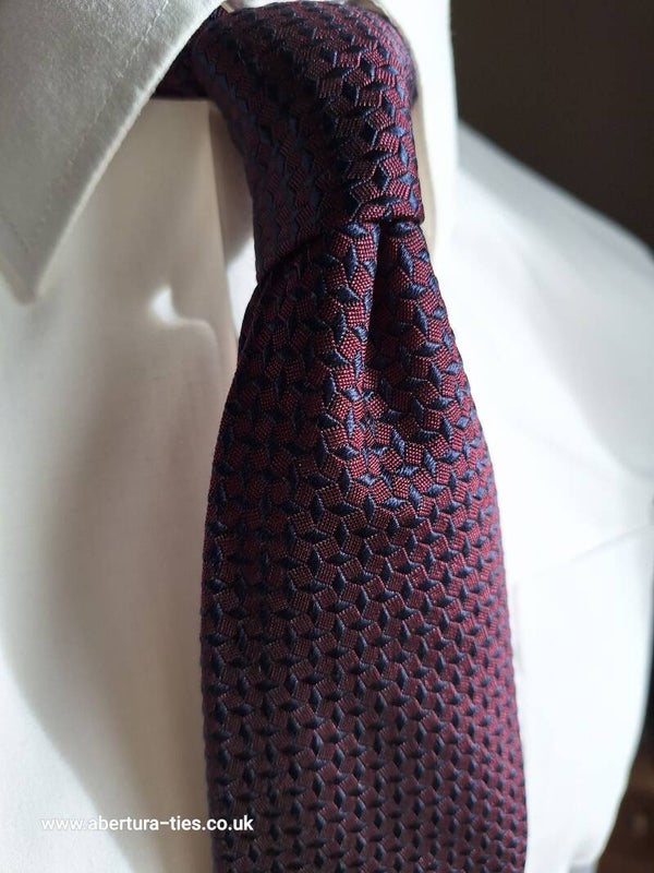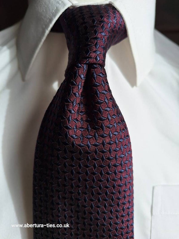 From the wonderful Italian brand, Boggi Milano, we are thrilled to bring you this delightful very deep purple silk tie decorated with a delicate raised pattern in navy.
