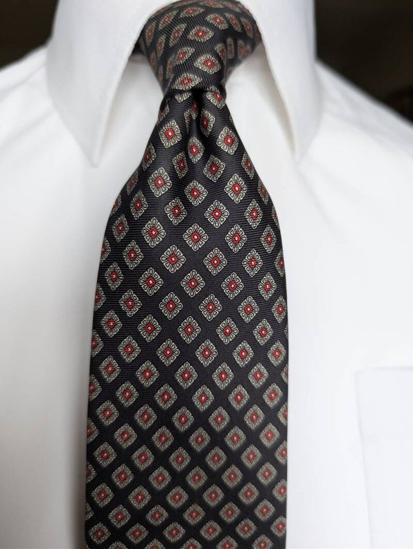 This wonderful vintage John Comfort tie is made from a stunning and soft navy British silk, decorated by a superb geometric pattern in silver and red.