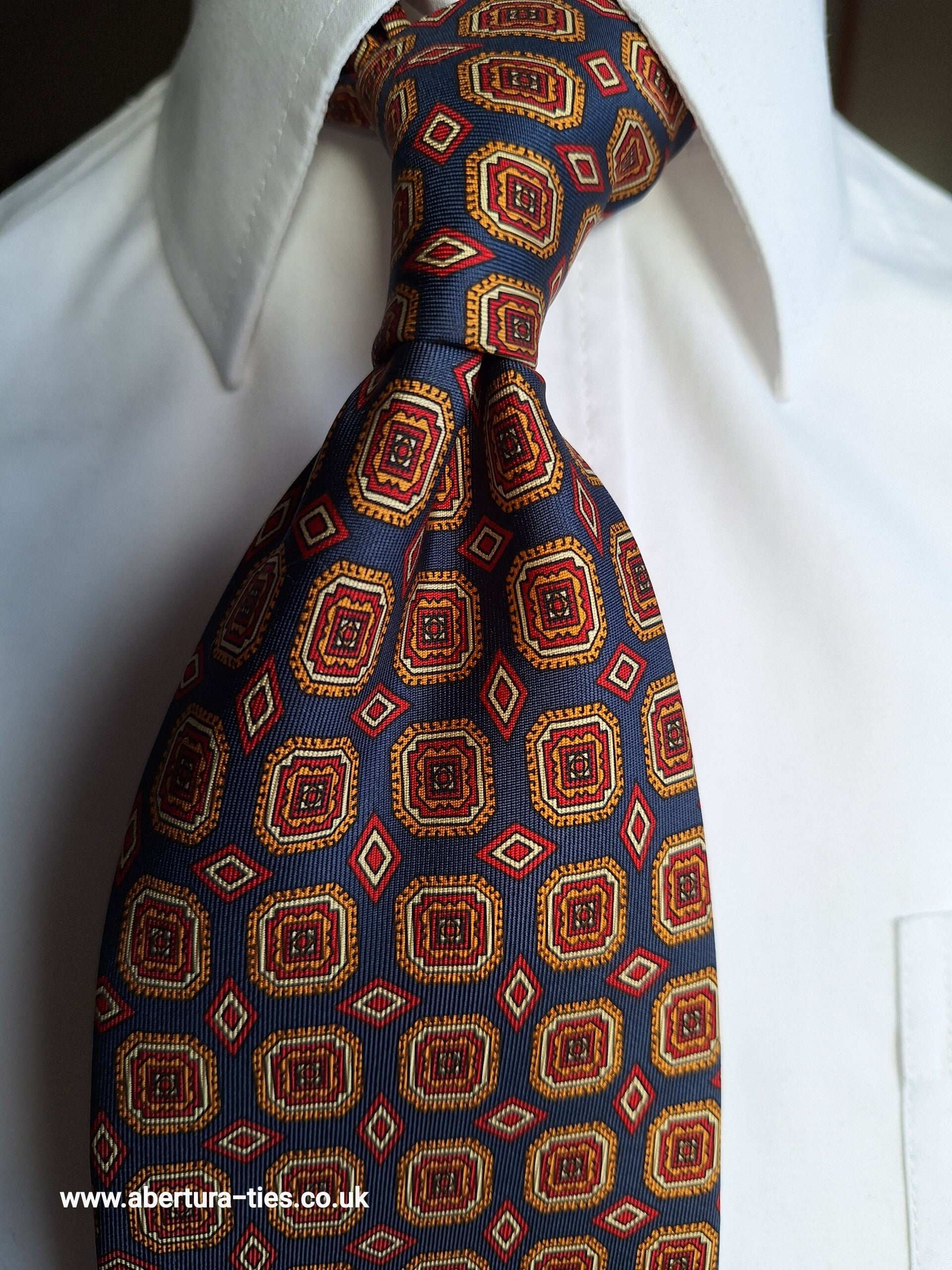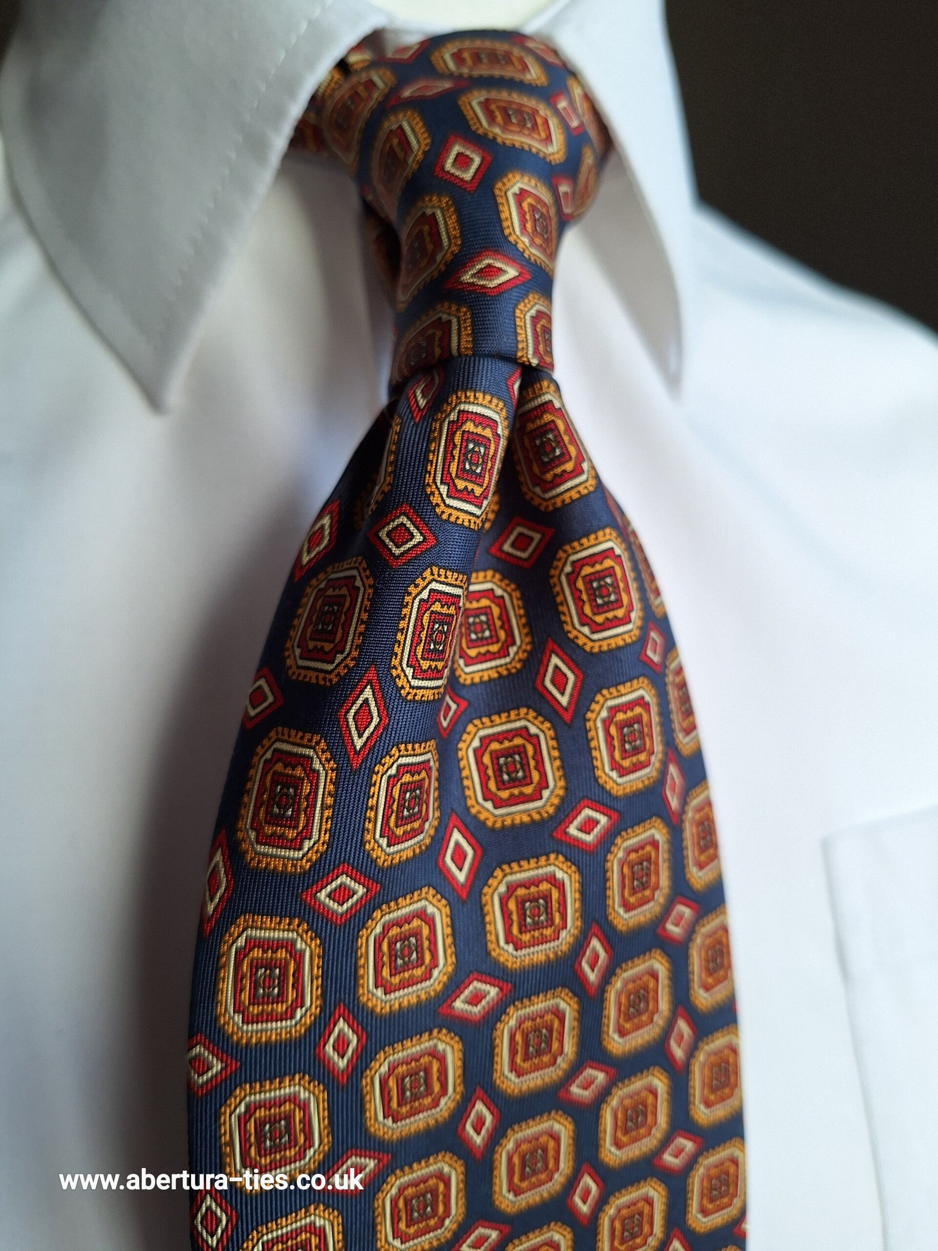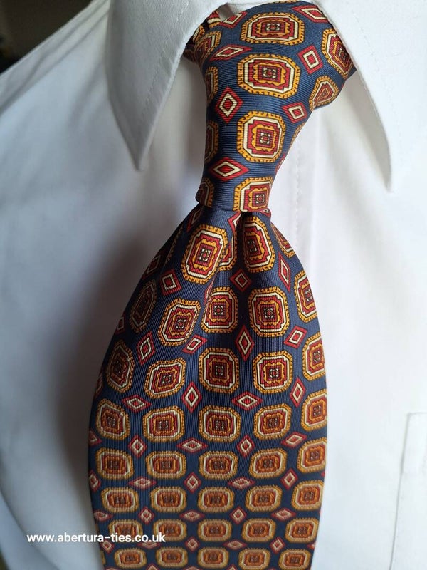 This is a truly outstanding tie - navy in colour with medallions of red, orange and gold, printed onto the softest of Italian silk.