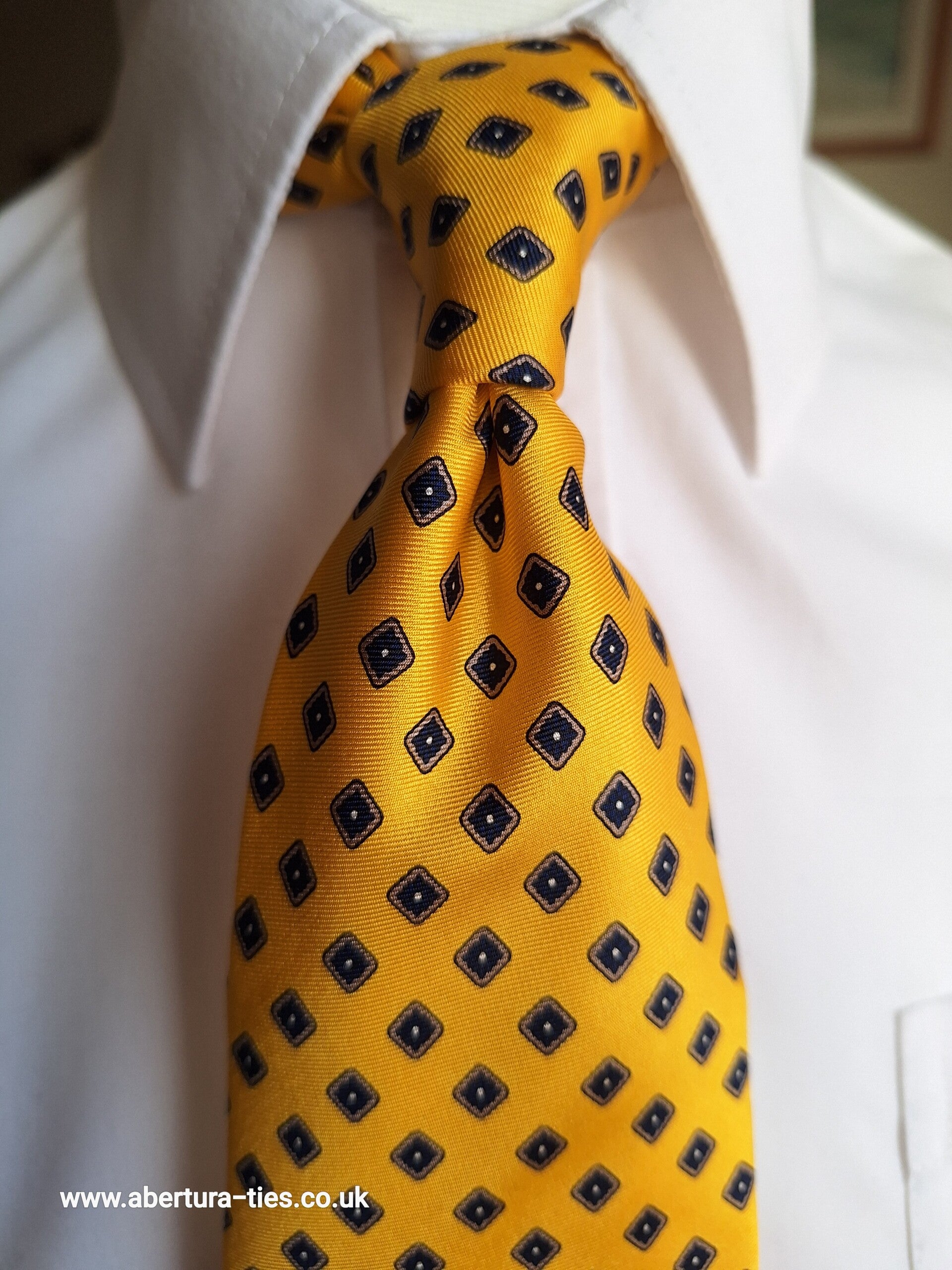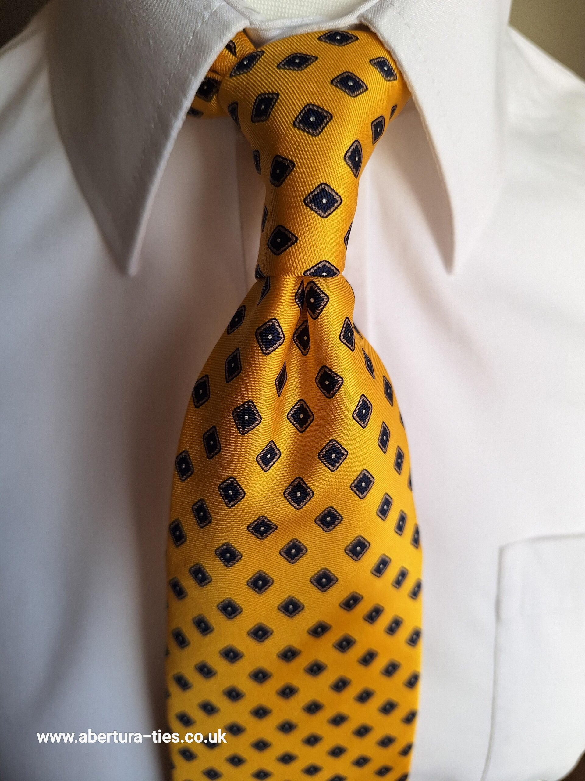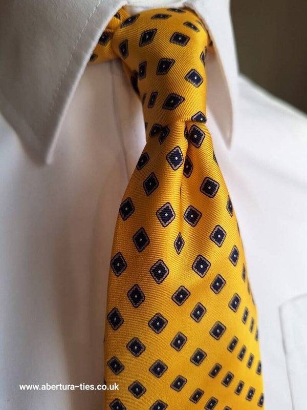 The soft silk has a golden yellow shade, and is decorated by navy diamonds and measures 150cm, with a blade of 8cm.
