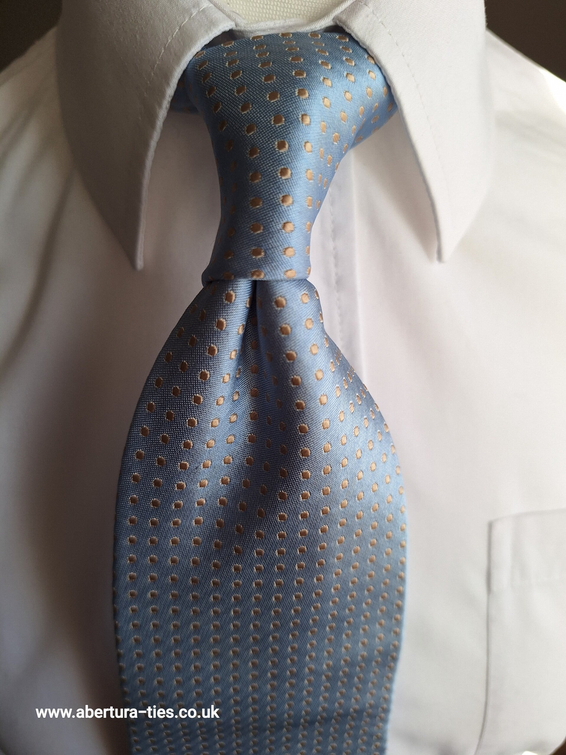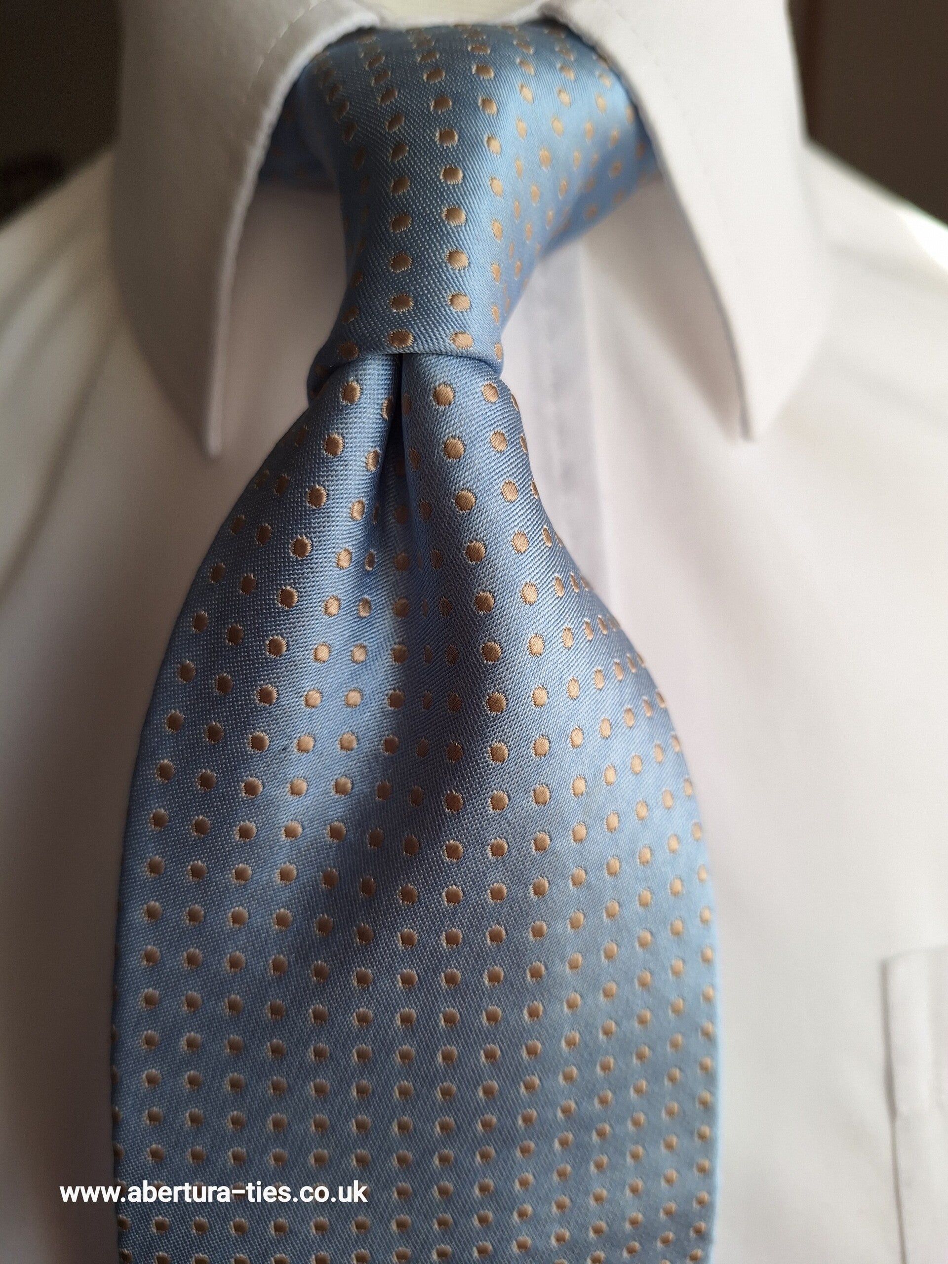 A silvery light blue base, with a discreet gold small polka dot design, makes up this outstanding Seven Fold tie - our Abertura Quarrington.