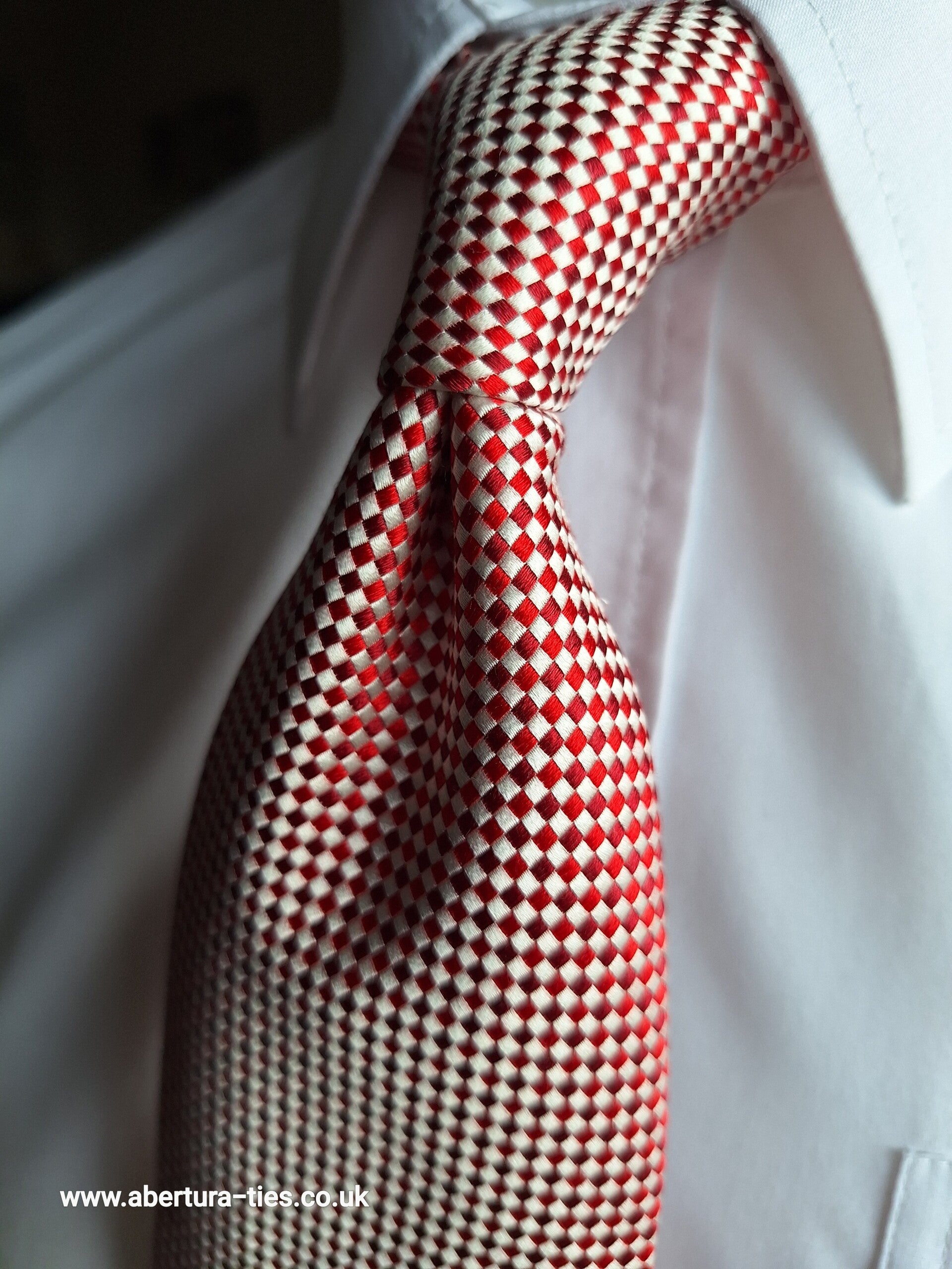 Measuring 148cm, with a blade of 9cm, this incredibly soft silk tie, delicately decorated by small red and silver squares is simply a sheer joy to wear.
