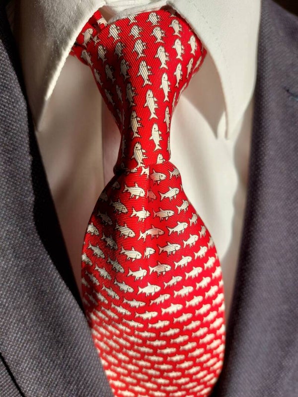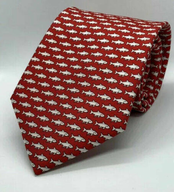 Red Hand Made Tie with Fish Pattern.