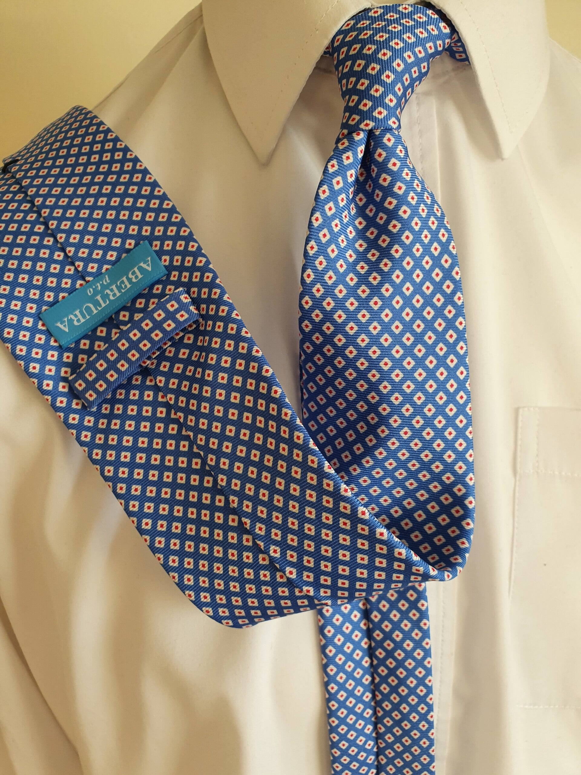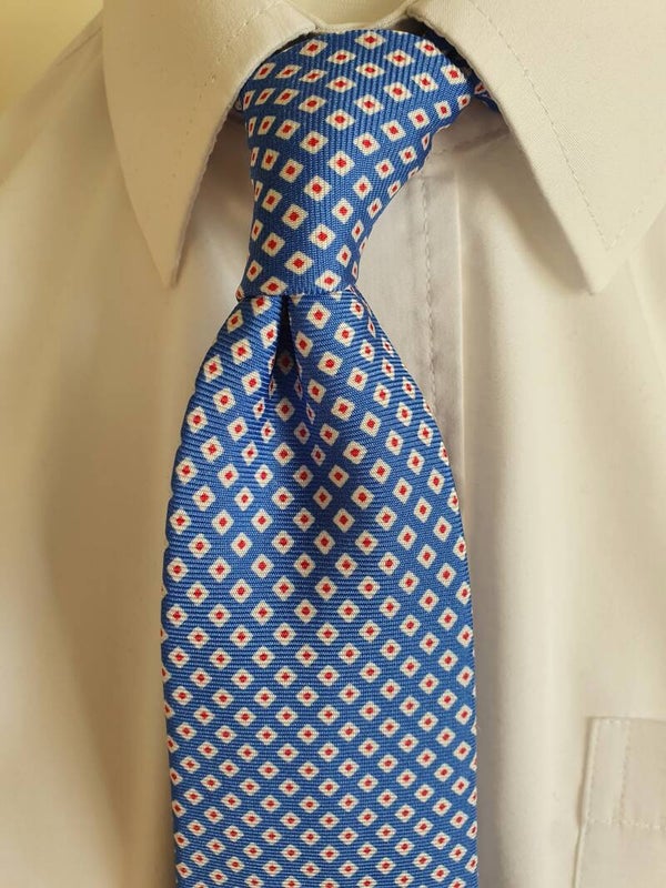- Three colour diamond pattern, hand finished, printed silk tie.