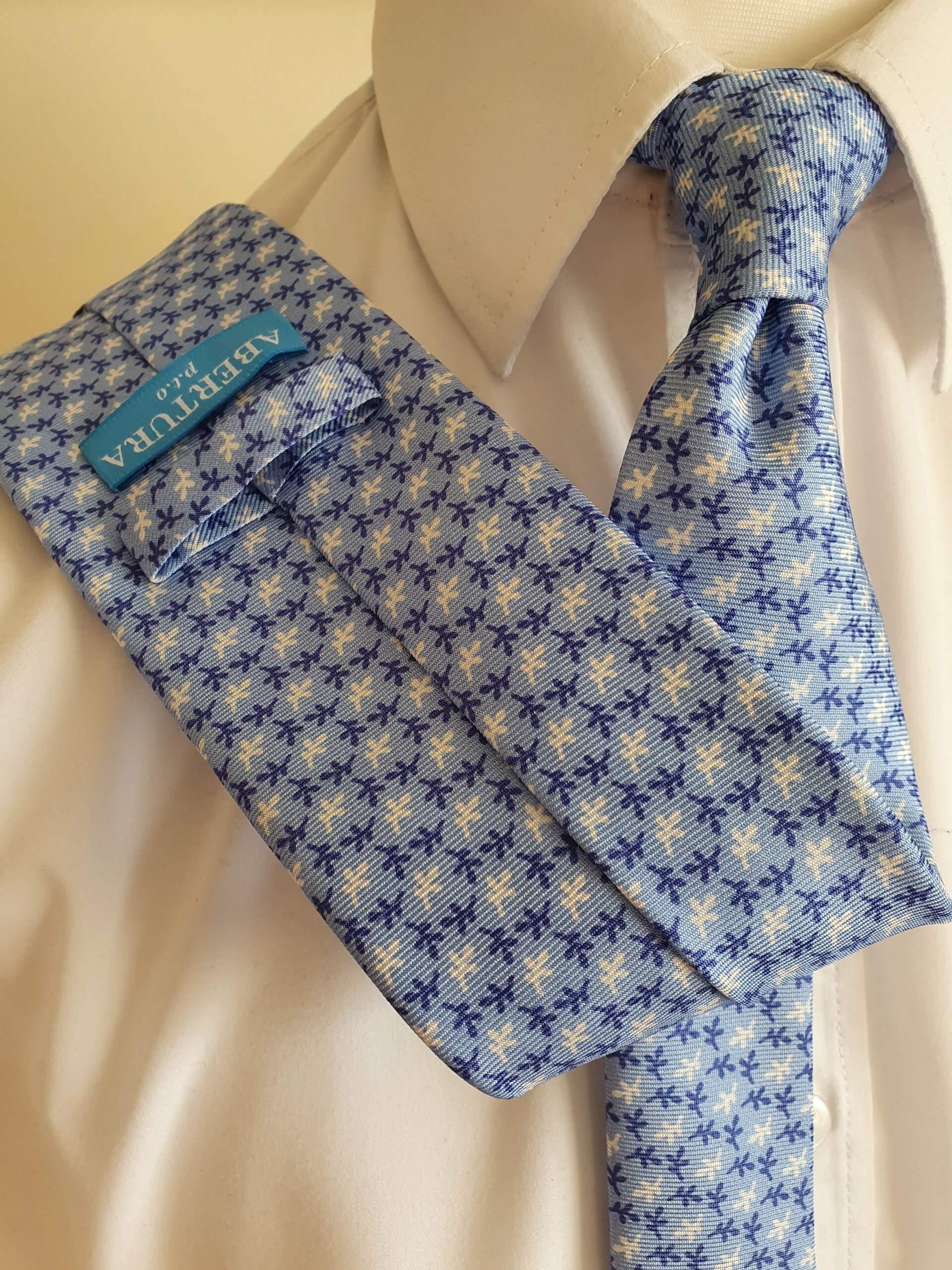 Hand finished, printed silk tie with a leaves pattern and silk navy tipping, made from 100% pure silk in the UK.