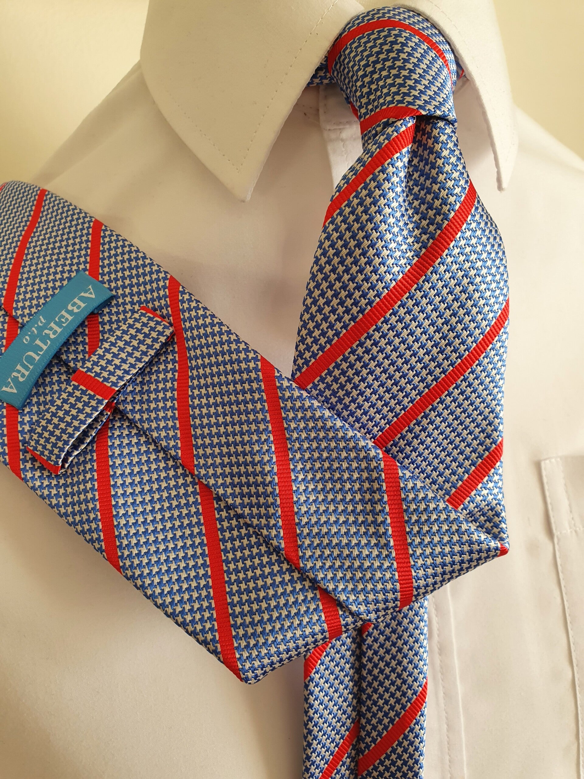 Hand finished, jacquard woven silk tie with a houndstooth with stripe pattern and silk navy tipping, made from silk twill in the UK.