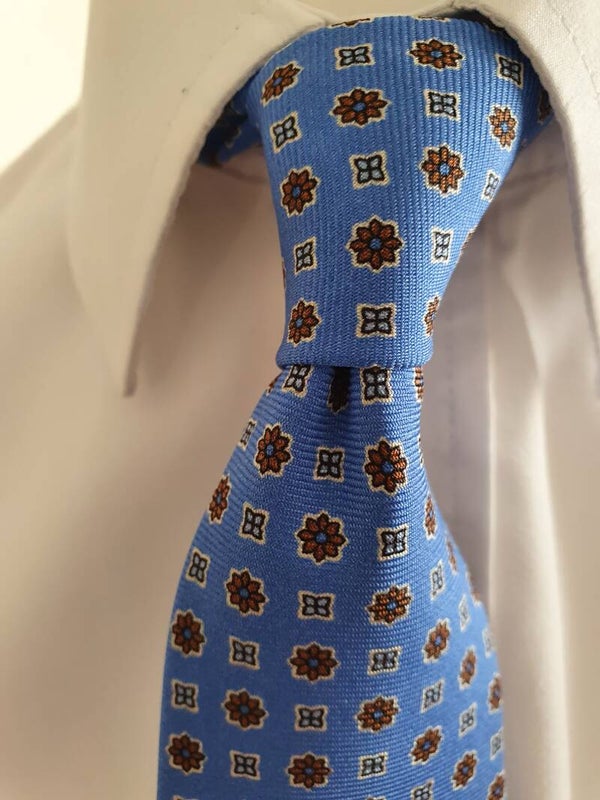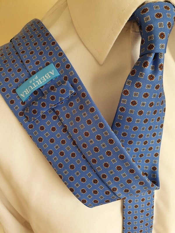 - Hand finished, printed silk tie with a neats pattern and silk navy tipping, made from 100% pure silk in the UK.