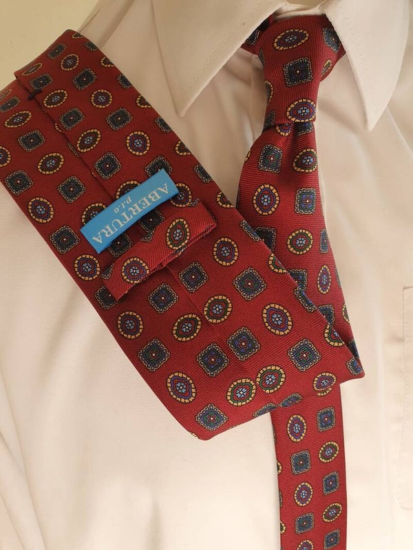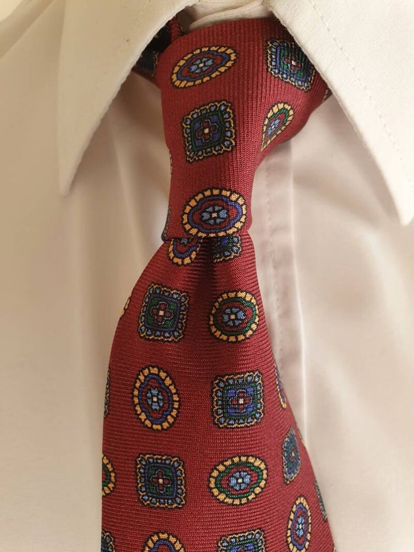 - Multi coloured Geometric Burgundy ground Purple Blue.
