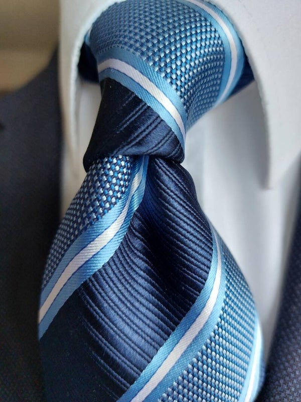 This stunning tie is an absolute eye-opener, featuring a navy base colour with white and sky blue stripes.