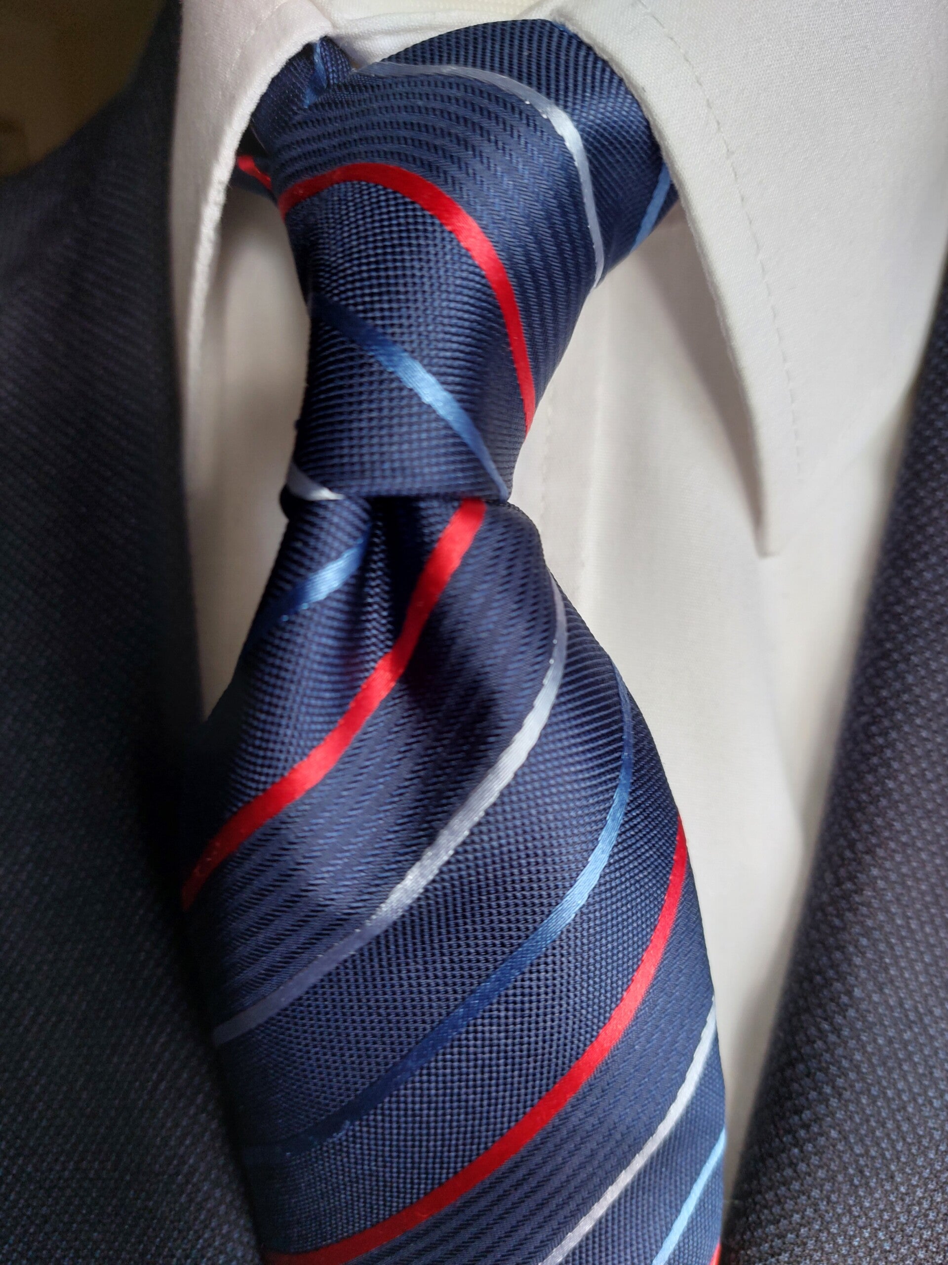 Highgrove is a beautiful seven fold twill in navy with red, blue and silver stripes running through.