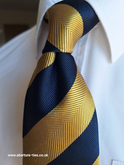 Our silk Abertura Kinloch is a beautiful seven fold tie with gold and navy thick stripes running the entire length.